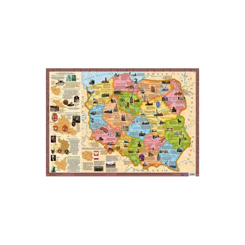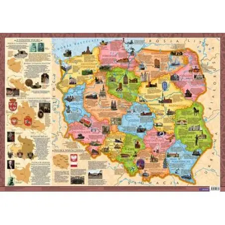 W każdym województwie umieszczono obrazki z opisami wybranych zabytków lub atrakcji turystycznych. Plakat zawiera także informacje o historii Polski, pokazuje jak granice naszego państwa