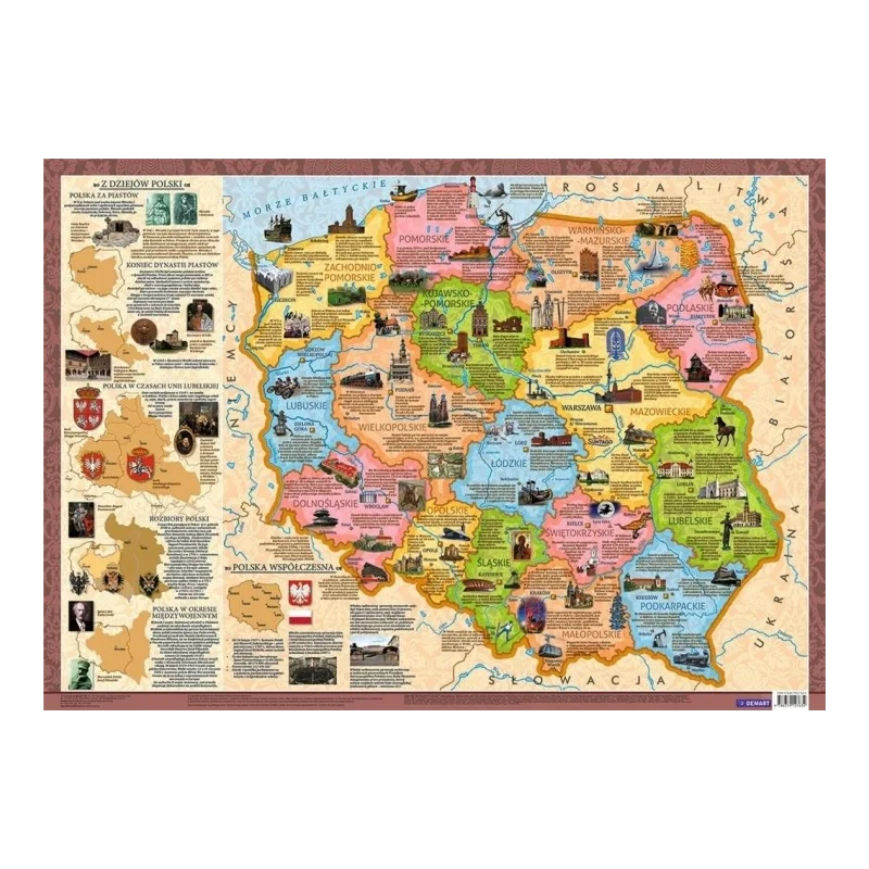W każdym województwie umieszczono obrazki z opisami wybranych zabytków lub atrakcji turystycznych. Plakat zawiera także informacje o historii Polski, pokazuje jak granice naszego państwa