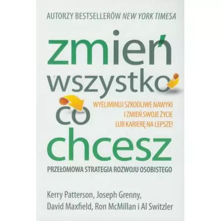 "Jednostki, które mają siłę zmienić swoje zachowanie, są silnymi jednostkami. Opanuj umiejętności przedstawione w tej książce i osiągnij nowy poziom osobistego oddziaływania." - Stephen R. Covey, autor poradnika "7 nawyków skutecznego działania"Starasz pozbyć się złego nawyku albo może nawet nałogu. Chcesz regularnie ćwiczyć i zdrowiej się odżywiać. Pragniesz rozruszać zastałą karierę lub wzmocnić podupadający związek. Wypróbowałeś już wiele obiecujących rozwiązań, ale pomimo podejmowanych starań nic nie udaje ci się zmienić. Czujesz, że tkwisz w miejscu, jesteś zniechęcony. Myślisz, że wszystkiemu winna jest słaba wola?Kluczem do zmiany jest zrozumienie wszystkich subtelnych, choć potężnych czynników, które kształtują dokonywane wybory! Istnieje Sześć Źródeł Siły Wpływu, które oddziałują na twoje codzienne decyzje. Zmień wszystko, co chcesz wyjaśnia, że istnieje ścisły związek tych sił z twoim życiem. Wykorzystaj te subtelne, choć potężne siły, tak aby przyniosły widoczne rezultaty!