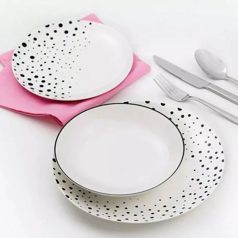 Zastawa porcelanowa Dotty to piękna kolekcja w ponadczasowej biało-czarnej kolorystyce. Zdobienie w postaci groszków i kropek zaprezentowano w zupełnie niecodzienny i wysublimowany sposób podkreślając nowoczesność linii. Wybrane produkty kolekcji z delikatnie zaznaczonymi czarnymi rantami dodają prawdziwego szyku oraz elegancji całej zastawie. Komplet obiadowy składa się z 18 elementów.