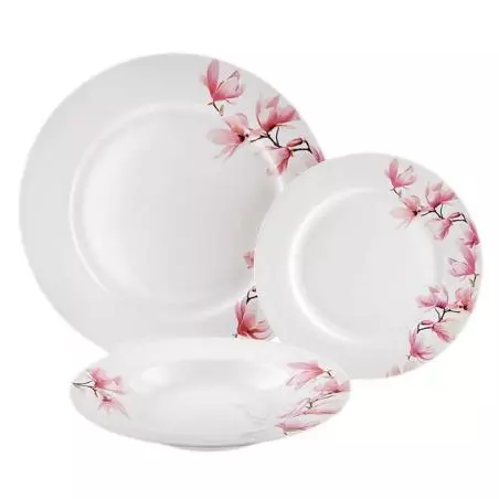 Komplet naczyń Magnolia to piękna i nowoczesna zastawa stołowa, która została wykonana z wysokogatunkowej, białej porcelany. W linii występuje również komplet kawowy oraz kubeczki. Każdy produkt z kolekcji został ozdobiony kolorowym wzorem kwiatowym, który idealne wkomponuje się w charakter każdej kuchni. Dzięki estetycznemu i efektownemu