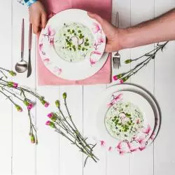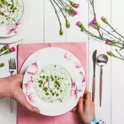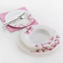 Komplet naczyń Magnolia to piękna i nowoczesna zastawa stołowa, która została wykonana z wysokogatunkowej, białej porcelany. W linii występuje również komplet kawowy oraz kubeczki. Każdy produkt z kolekcji został ozdobiony kolorowym wzorem kwiatowym, który idealne wkomponuje się w charakter każdej kuchni. Dzięki estetycznemu i efektownemu wykonaniu z łatwością dobierzesz do niego pozostałe elementy zastawy stołowej. Jego ponadczasowy wzór sprawi, że Twoja jadalnia nabierze wyjątkowego charakteru.