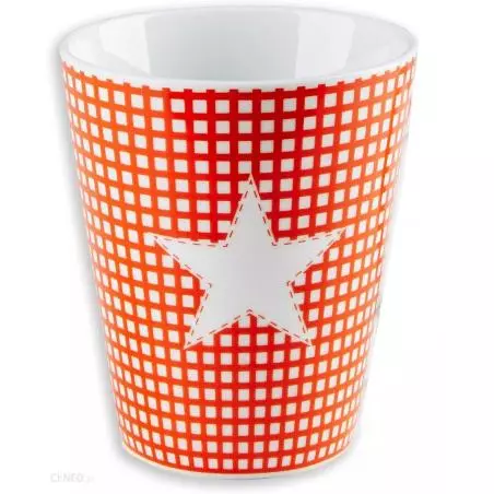 - ceramiczny kubek termiczny ozdobiony wzorem w kratkę i wizerunkiem gwiazdek