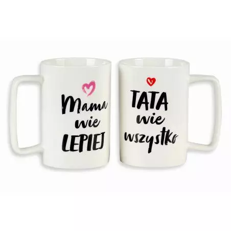 - ozdobione napisami, na jednym napis: ",TATA wie wszystko",, na drugim: ",MAMA wie lepiej",