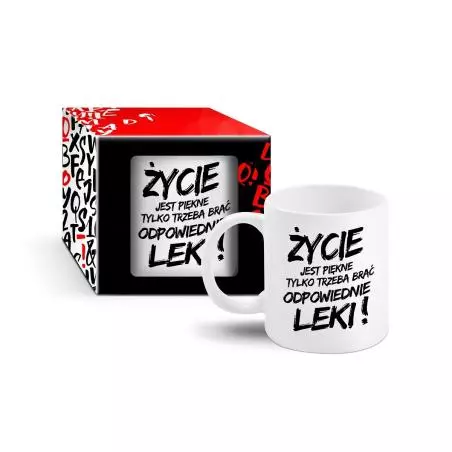 Jego biała powierzchnia jest idealna do wyeksponowania kreatywnego napisu: "Życie jest piękne tylko trzeba brać odpowiednie leki". Te słowa są nie tylko inspirujące, ale również dodają nuty humoru do codziennego rytuału picia ulubionego napoju.