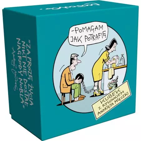 - oryginalny kubek ozdobiony rysunkiem i aforyzmem Andrzeja Mleczki - „Pomagam jak potrafię”