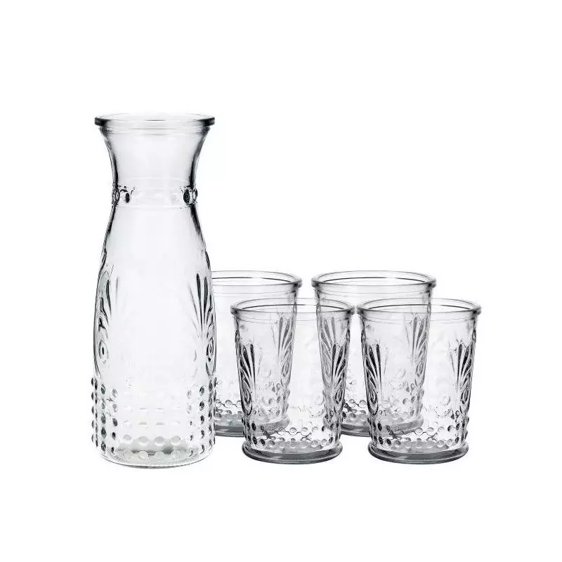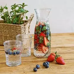 Zarówno karafka, jak i szklanki, wykonane zostały z transparentnego szkła. Nie przenosi ono zapachów i smaków, nie reaguje z kwasami, a także jest łatwe w czyszczeniu. Dzięki transparentnemu kolorowi szkła możesz kontrolować na bieżąco poziom zawartości.