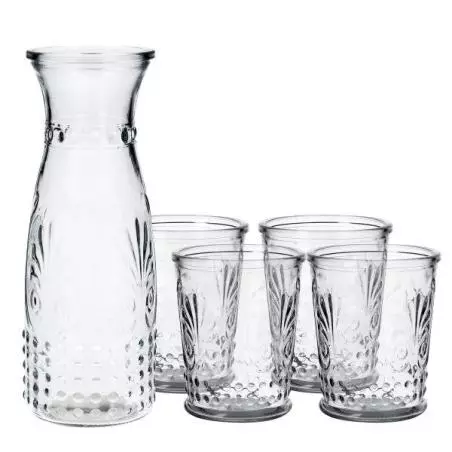 W skład zestawu wchodzi karafka i 4 szklanki o pojemności 350 ml. Karafka posiada klasyczny kształt - na planie koła, o prostych szklankach, z subtelnym zwężeniem i szeroką szyjką ułatwiającą nalewanie. Na bocznych powierzchniach każdego elementu zestawu dostrzec można strukturalne zdobienia - żłobienia o abstrakcyjnych kształtach i geometrycznie rozłożone kropki.