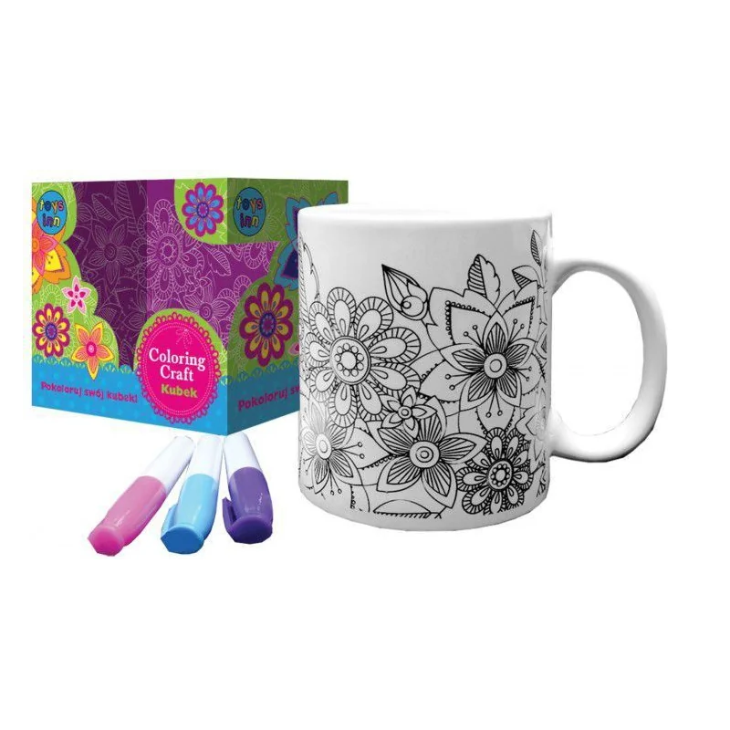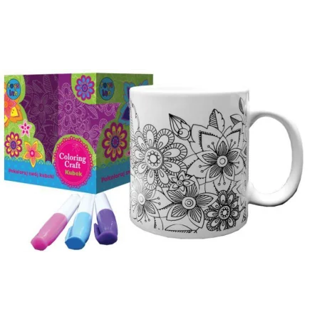 Zestaw do kolorowania: kubek + 4 kolorowe markery: błękitny, fioletowy, różowy, zielony.