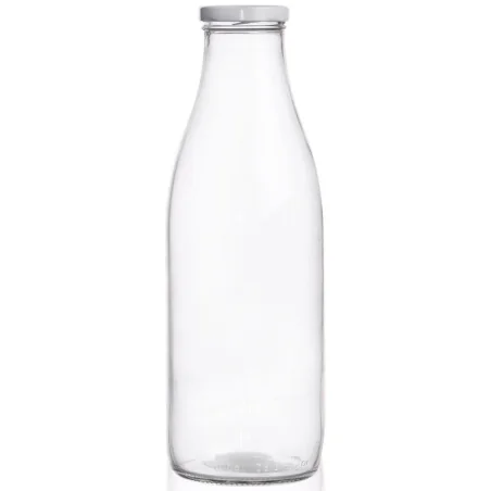 POJEMNA - Szklana butelka o pojemności 1 litra z zakrętką. Sprawdzi się do przechowywania mleka i serwowania różnych napojów. Butelka ma wysokość 26,5 cm i średnicę 8 cm.