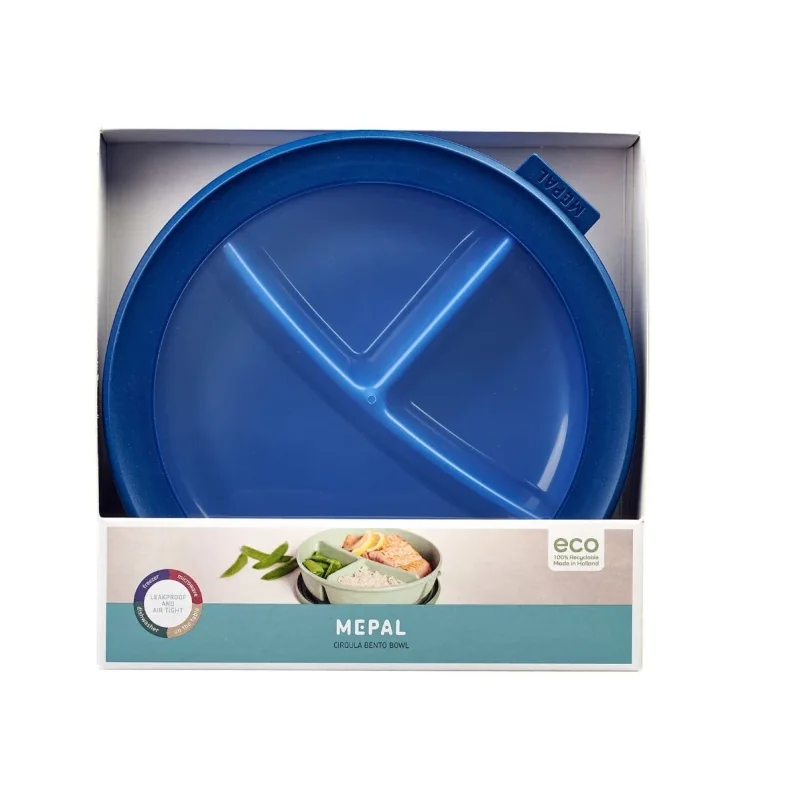- Miska Cirqula bento z 3 przegródkami, ma dwie mniejsze przegródki o pojemności 250 ml i większą o pojemności 500 ml.