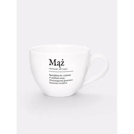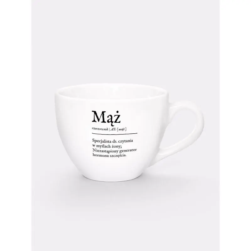 - Nadruk z cytatem po dwóch stronach kubka, logo na spodzie