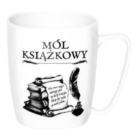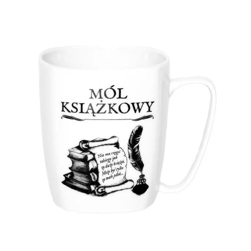 Kubek MÓL KSIĄŻKOWY z napisem „Nie ma czegoś takiego jak za dużo książek. Może być tylko za mało półek” to niezastąpiony atrybut każdego miłośnika książek! Poza piękną porcelaną kubek ma wyjątkowe właściwości objętościowe, które sprawią, że żaden mól książkowy nie zazna nigdy więcej uczucia pragnienia. Warto też