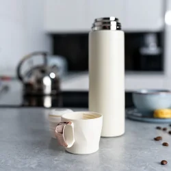 Termos nierdzewny od Altom Design jest lekki i wygodny do przenoszenia. Przeznaczony zarówno do gorących jak i zimnych napojów. Posiada szczelny system zamykania i otwierania. Ciekawa jest bardzo zakrętka – w kształcie filiżanki, którą wykorzystać możemy do picia. Termos wykonany został z wysokiej jakości stali nierdzewnej, dzięki czemu jest trwały i łatwy w utrzymaniu czystości. Produkt występuje w dwóch rozmiarach pojemnościowych 500ml oraz 580ml. Niezwykle modne kolory - ponadczasowe połączeni bieli ze złotem, czerni ze złotem oraz ciekawa zieleń sprawia, że każdy wybierze idealny dla swoich upodobań.