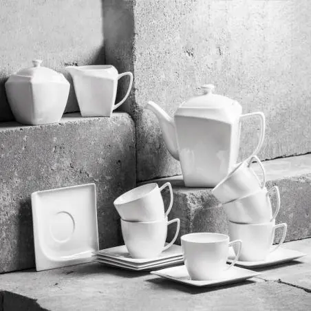 Komplet kawowy 17-elementowy z serii Monaco marki Ambition to połączenie elegancji, nowoczesnego designu i wysokiej jakości wykonania. Zestaw wykonano z porcelany New Bone China, która jest dodatkowo wzmacniana, co zapewnia większą odporność na obtłuczenia i wysokie temperatury.