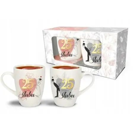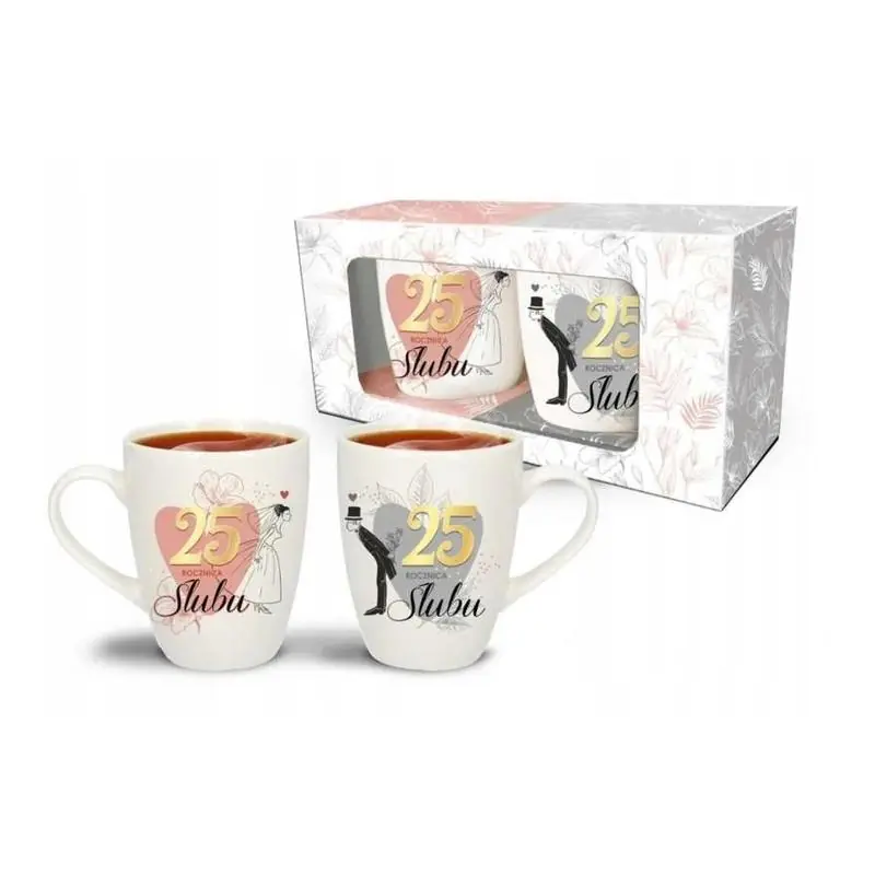 Zestaw 2 kubków 25. rocznica ślubu to połączenie elegancji, praktyczności i symboliki jubileuszowej. Kubki są trwałe, bezpieczne w użytkowaniu i stanowią wyjątkowy prezent dla pary obchodzącej srebrne gody, który przypomina o wspólnie spędzonych latach.