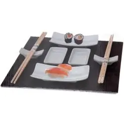 Zestaw idealnie sprawdzi się do serwowania sushi, sashimi oraz innych dań kuchni azjatyckiej. Może być wykorzystywany podczas romantycznej kolacji dla dwojga, spotkań z przyjaciółmi lub domowego sushi party. Funkcjonalny układ elementów ułatwia zarówno przygotowanie, jak i estetyczne podanie potraw.