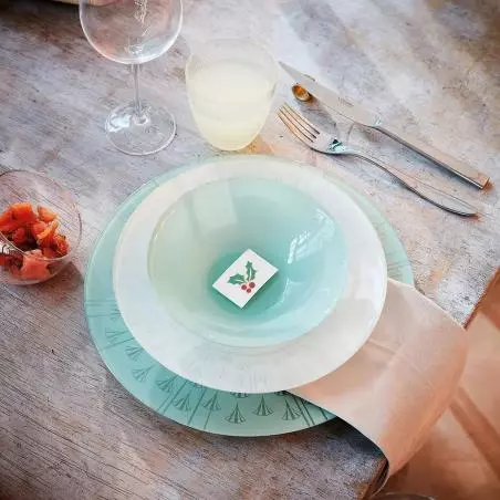 Komplet obiadowy Eclisse urzeka kolorystyką i oryginalnym wzornictwem. Subtelny, biały i seledynowy kolor w połączeniu z przezroczystym, delikatnym motywem na rancie talerzy tworzą niebanalną estetykę. Produkt marki Luminarc zaprojektowany w zgodzie z najnowszymi trendami. Świetnie wkomponuje się w aranżację kuchni w stylu skandynawskim, który