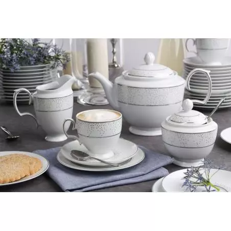 Zestaw do kawy z kolekcji MariaPaula Snow charakteryzuje się bielą porcelany, która przebita jest z przez żłobione dekoracje i platynowe kropki imitujące płatki śniegu. Platynowa linia namalowana została ręcznie, przez co całość nabiera rękodzielniczego i gustownego charakteru. Polska porcelana MariaPaula wykonywana jest tylko w rodzimych fabrykach, a przy jej produkcji wykorzystano nowoczesne jak i tradycyjne metody obróbki.