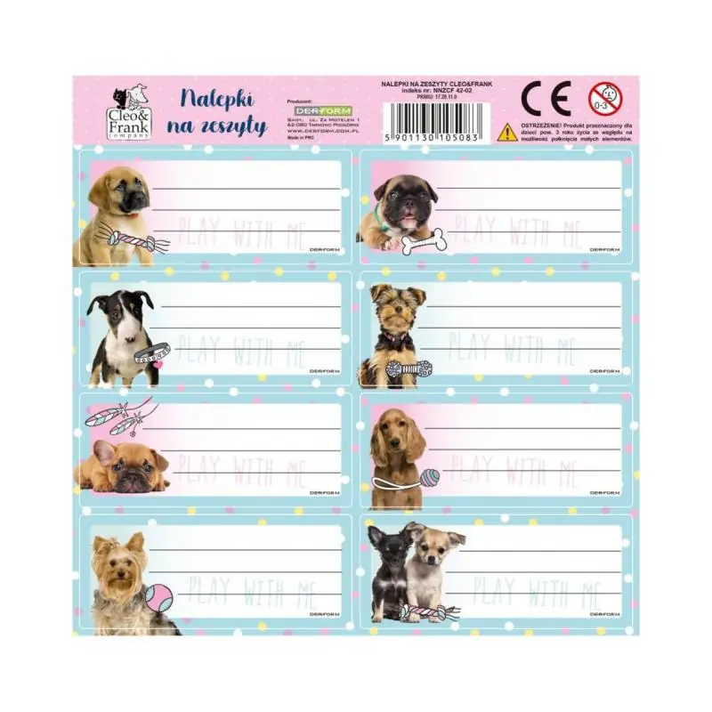 Nalepki na zeszyt z pieskami Cleo & Frank. Mega modny wzór i genialne kolory. Świetnie zdobią zeszyt. Wybierz nalepki Derform!