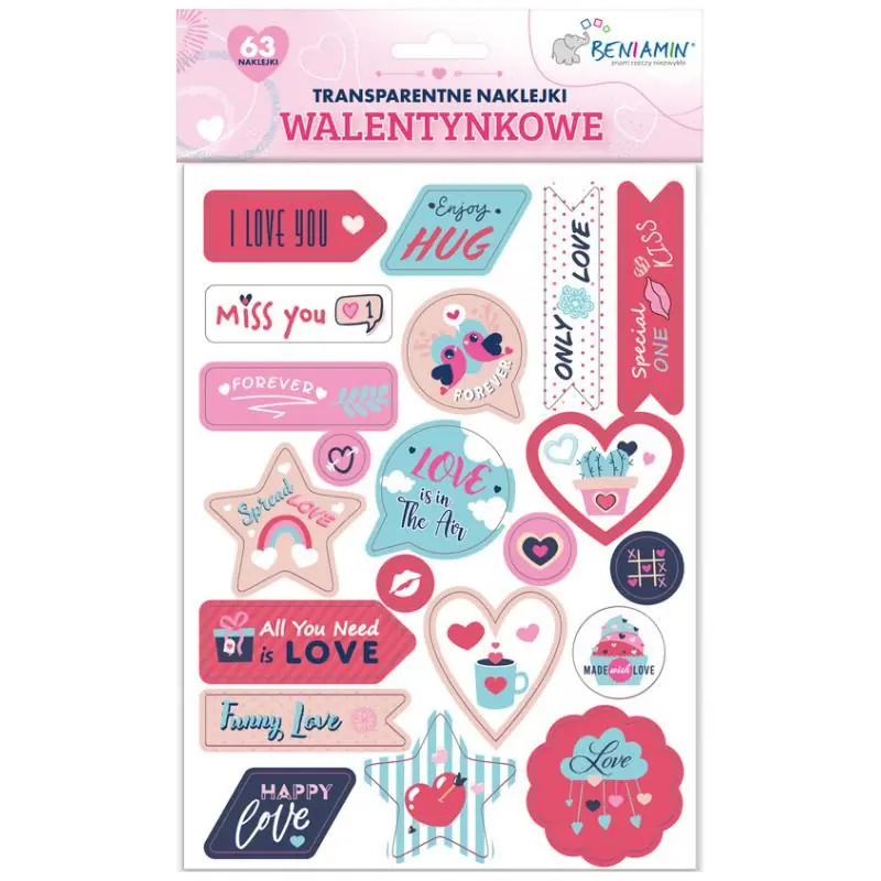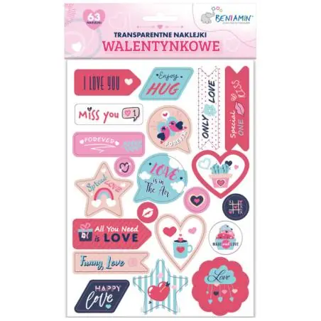 Zestaw 63 walentynkowych naklejek dekoracyjnych. Jeśli dajesz prezent komuś bliskiemu, udekoruj go tematycznymi naklejkami, na pewno wywoła to uśmiech na jego twarzy. Dzięki nim stworzysz również oryginalne dekoracje i własnoręczne podarunki. Idealne na wiele okazji.