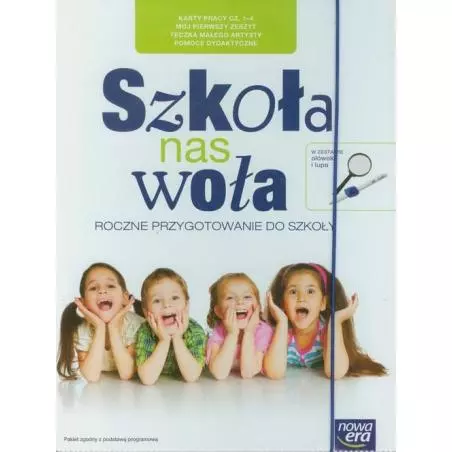 „Szkoła nas woła” to roczne, urozmaicone przygotowanie do pierwszej klasy. Ten starannie skomponowany zbiór zabaw, zadań i ćwiczeń wspomaga rozwój dzieci we wszystkich obszarach kluczowych dla odniesienia szkolnego sukcesu. W skład tego pakietu wchodzą ciekawe, innowacyjne materiały dydaktyczne dla ucznia oraz nauczyciela. Wśród nich dziecko znajdzie między innymi Karty pracy (4 części), Teczkę małego artysty, pomoce dydaktyczne (m.in. historyjki obrazkowe, domino, sylwety do zabawy) czy „Mój pierwszy zeszyt” zachęcający do ćwiczenia grafomotoryki. Nauczyciela na pewno ucieszą program, plan pracy i propozycje zajęć, instrukcje do Teczki małego artysty, Zabawy ruchowe, muzyczne i logopedyczne, a także książka z wyborem tekstów literackich dostosowanych do wieku i zainteresowań dzieci, dwie płyty CD z muzyką, kolorowe plansze dydaktyczne oraz karty pracy do diagnozy wstępnej i końcowej wraz z kompletnym programem SPE.