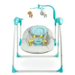 Huśtawka elektryczna o solidnej i stabilnej konstrukcji, wyposażona w 5-punktowe szelki bezpieczeństwa oraz stopki z podkładkami antypoślizgowymi. Cechuje się kolorową tapicerką wykonaną z delikatnej, przyjemnej w dotyku tkaniny oraz miękką poduszką pod głowę.