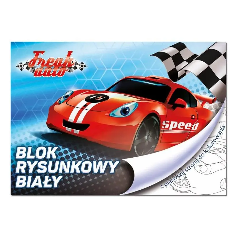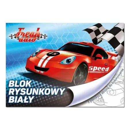 Blok rysunkowy biały, format A4, 20 kartek. Na pierwszej stronie kontury do pokolorowania. Kolorowa przednia okładka, tył szara tektura, klejony z boku.
