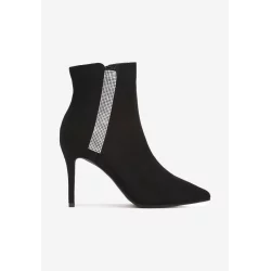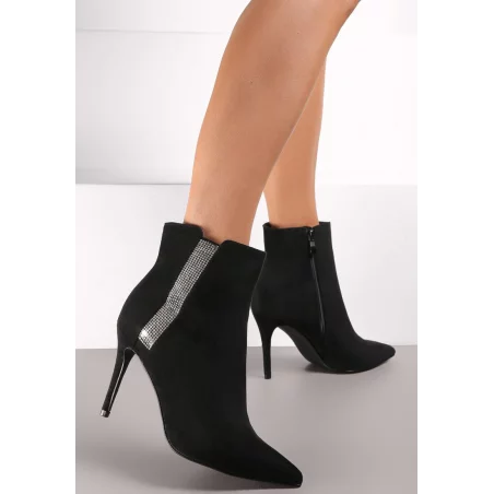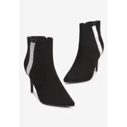 Botki Siby ze szpiczastym noskiem. Osadzone na wysokiej, powlekanej szpilce. Zewnętrzny bok zdobiony szeroką lamówką pokrytą cyrkoniami. Zapinane na zamek błyskawiczny. Wykonane z ekozamszu, wkładka z materiału. Najlepiej leżą na wąskiej stopie. Eleganckie botki na obcasie z cyrkoniami to wyjątkowy model, którego nie może zabraknąć w Twojej szafie!