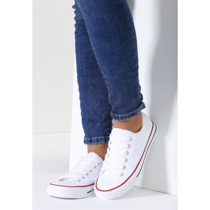 Trampki Messyphise o kultowym, klasycznym fasonie, z cholewką przed kostkę. Osadzone na płaskiej podeszwie zdobionej czarnymi lamówkami. Sznurowane, z gumowym noskiem o zaokrąglonym kształcie. Wykonane z materiału tekstylnego. Niskie trampki to ponadczasowa perełka, której nie może zabraknąć w Twojej garderobie.