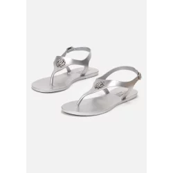 Sandały Merila na płaskiej, minimalistycznej podeszwie, o fasonie japonek. Z połączonymi paskami między palcami, na podbiciu, wokół kostki i pięty. Zapinane na klamrę. Ozdobione metalowym elementem na środku. Wykonane z gumy - zarówno cholewka, jak i podeszwa. Wspaniale zaprezentują się w duecie z szortami i długimi spodniami.