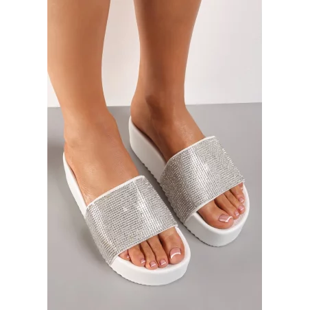 Klapki Peeky wsuwane, z zaokrąglonym, odkrytym noskiem. Stopę oplata szeroki pasek dekorowany mieniącą się imitacją cyrkonii. Osadzone na wysokiej platformie, zdobionej drobnymi wycięciami. Wykonane z materiału tekstylnego, z wkładką z ekoskóry. Zrobią furorę w letnich stylizacjach! Przy zakupie rekomendujemy wybór rozmiaru o 1