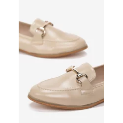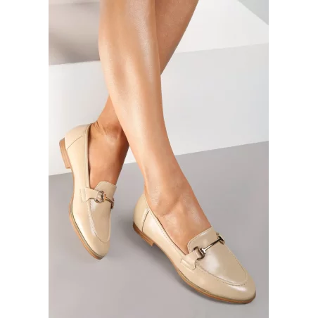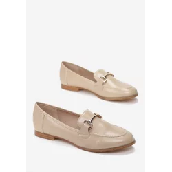 Mokasyny Sakina udekorowane przeszyciami i biżuteryjnym elementem z metalu, z okrągłym noskiem. Wsuwane, z klasyczną cholewką. Na płaskim obcasie. Wykonane z ekoskóry. Dopasowują się fantastycznie do stylizacji w eleganckim charakterze na ciepłe dni!
