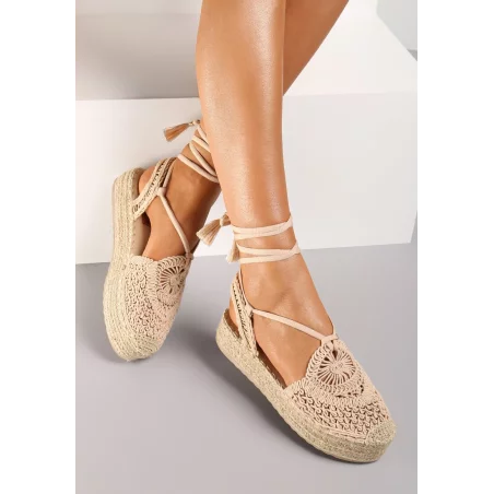 Espadryle Lasthyne osadzone na platformie udekorowanej wraz z noskiem jutowym splotem. Z zakrytym, zaokrąglonym noskiem. Wykonane z materiału tekstylnego o fasonie szydełkowej koronki. Wiązane wokół kostki na cienkie sznurki wychodzące ze śródstopia oraz zakończone stylowymi frędzlami. Najlepiej leżą na wąskiej stopie. Espadryle Lasthyne