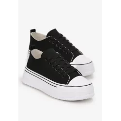 Trampki Ranya o klasycznej i jednocześnie unowocześnionej formie. Osadzone na wysokiej, gumowej platformie, która jest hitem w tym sezonie. Cholewka sięgająca kostki, stworzona z solidnego materiału tekstylnego. W środku wyściółka, jak i miękka wkładka z materiału. Okrągły nosek wzmocniona gumową wstawką. System sznurowania pozwoli na