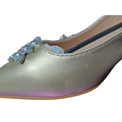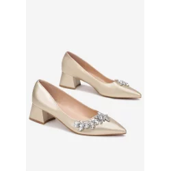 Czółenka Anani na niskim słupku. Wykonane z imitacji skóry wraz z wkładką. Szpiczaste noski ozdobione kryształkami. Eleganckie czółenka Anani idealne na każdą okazję.