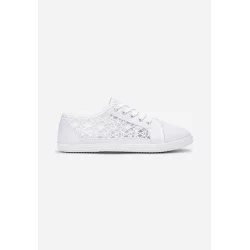 Tenisówki Alethaeia z cholewką odsłaniającą koskę, ozdobione po boku prześwitującą, koronkową siateczką. Wiązane na płaskie sznurówki. Osadzone na elastycznej podeszwie. Wykonane z materiału tekstylnego. Lubisz przemycać do casualowo-sportowych stylizacji romantyczne akcenty? Te buty Ci w tym pomogą!
