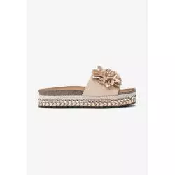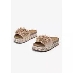 Klapki wsuwane, z zaokrąglonym noskiem i profilowaną podeszwą. Wokół stopy szeroki pasek wykonany z ekozamszu. Przód dodatkowo zdobiony kwiatową dekoracją. Osadzone na korkowej platformie zdobionej nitami oraz przeszyciami. To klapki, które przykują uwagę każdej fanki romantycznych i letnich stylizacji! Sugerujemy wybór rozmiaru o 1