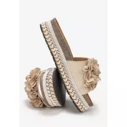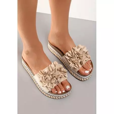 Klapki wsuwane, z zaokrąglonym noskiem i profilowaną podeszwą. Wokół stopy szeroki pasek wykonany z ekozamszu. Przód dodatkowo zdobiony kwiatową dekoracją. Osadzone na korkowej platformie zdobionej nitami oraz przeszyciami. To klapki, które przykują uwagę każdej fanki romantycznych i letnich stylizacji! Sugerujemy wybór rozmiaru o 1 większego.