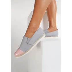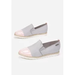 Slip On Ebullience wsuwane. Z okrągłym noskiem powleczonym wstawką w kontrastowym odcieniu. Osadzone na płaskiej, podwójnej podeszwie. Dolna część z protektorem, górna zdobiona warkoczem z huty, Na podbiciu, po bokach wstawki z elastycznej gumki w dopasowanym odcieniu. Cholewka zdobiona delikatnym printem, przypominającym marmur. Wykonane z lakierowanej ekoskóry. Wkładka ze skóry naturalnej. Idealne na smukłą stopę, sugerujemy wybór rozmiaru o jeden większego. Doskonałe do codziennych stylizacji.