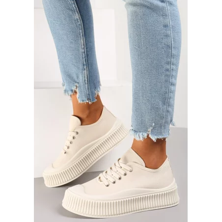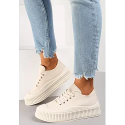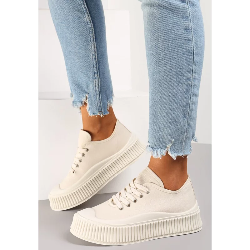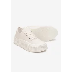 Trampki Evanie sznurowane, sięgające przed kostkę. Model na grubej platformie ozdobionej dookoła pionowymi wycięciami. Z okrągłym noskiem wykonanym z gumy. Cholewkę wykonano z materiału tekstylnego. Totalny must have tego sezonu! Trampki na platformie zrobią furorę w stylizacjach sportowych.
