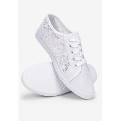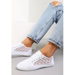 Tenisówki Alethaeia z cholewką odsłaniającą koskę, ozdobione po boku prześwitującą, koronkową siateczką. Wiązane na płaskie sznurówki. Osadzone na elastycznej podeszwie. Wykonane z materiału tekstylnego. Lubisz przemycać do casualowo-sportowych stylizacji romantyczne akcenty? Te buty Ci w tym pomogą!