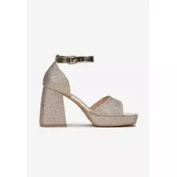 Sandały Vynthe na stożkowym obcasie oraz niewysokiej platformie. Z zakrytą piętą i odkrytymi palcami. Nosek o supermodnym, kwadratowym kształcie. Wokół kostki metaliczny pasek z klamerką, która pozwala na regulacje obwodu. Wykonane z ekoskóry, zdobione połyskującym brokatem. To eleganckie sandałki, które bedą przyciągać zachwycone spojrzenia!