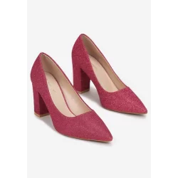 Czółenka Navo z brokatową cholewką i obcasem. Obcas typu słupek, nosek szpiczasty. Sugerujemy wybór rozmiaru o jeden większego.