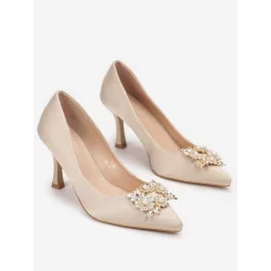 Czółenka Voldaia ze szpiczastym noskiem, osadzone na niewysokiej szpilce. Wykonane z satynowej tkaniny, wewnątrz wkładka z ekoskóry. Przód dekorowany metalową ozdobą wysadzaną imitacją cyrkonii. Prezentują się niezwykle kobieco i elegancko.