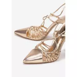 Eleganckie sandały Menino wykonane z materiału imitującego skórę. Osadzone na wysokim obcasie typu szpilka. Szpiczaste, zakryte noski połączone są z rzemykami wiązanymi wokół łydki. Modne sandały Anwen idealne na każdą elegancką okazję. Rozmiarówka zaniżona - kup rozmiar większy, niż zazwyczaj.