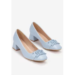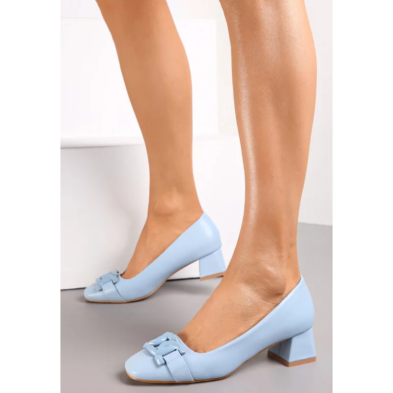 Czółenka Earla z klamerką na kwadratowym nosku w kształcie łańcucha. Wsuwane, na niewysokim, powleczonym stożku.