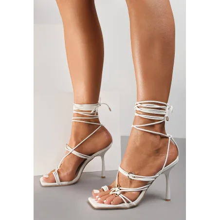 Sandały Evobe wykonane z ekologicznej skóry, wraz z wkładką. W stylu japonek, z supermodnym, kwadratowym noskiem. Osadzone na wysokiej szpilce. Przód wykonany z przeplatanych rzemyków, zdobionymi kółkami kaletniczymi w złotym kolorze. Wiązane wokół kostki, zapewniając stabilność. Poszukujesz szykownych sandałków, które wyróżnią Cię z