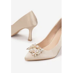 Czółenka Voldaia ze szpiczastym noskiem, osadzone na niewysokiej szpilce. Wykonane z satynowej tkaniny, wewnątrz wkładka z ekoskóry. Przód dekorowany metalową ozdobą wysadzaną imitacją cyrkonii. Prezentują się niezwykle kobieco i elegancko.