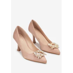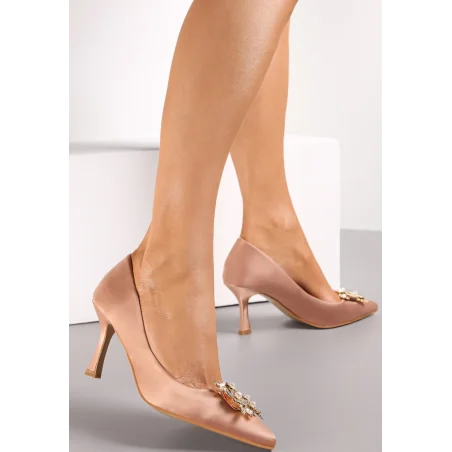 Czółenka Voldaia ze szpiczastym noskiem, osadzone na niewysokiej szpilce. Wykonane z satynowej tkaniny, wewnątrz wkładka z ekoskóry. Przód dekorowany metalową ozdobą wysadzaną imitacją cyrkonii. Prezentują się niezwykle kobieco i elegancko.